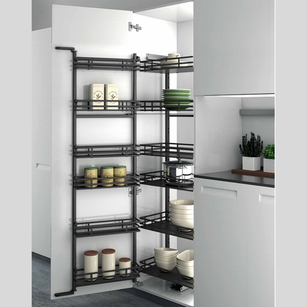This system creates an organised, high-capacity storage unit and ensures full use of the cabinet’s internal space. It is also suitable for 2-door larder units without a centre panel, offering excellent flexibility in kitchen design.