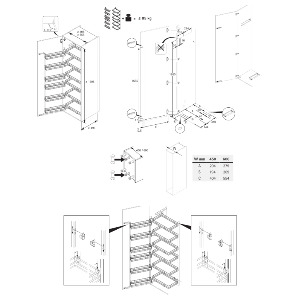 • Minimum inside cabinet body height: 1695 mm