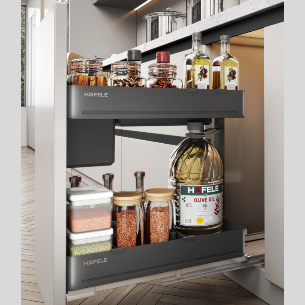 The Häfele Utensio Plus H2 Multi Base Unit is a premium pull-out storage solution designed specifically for daily cooking essentials.