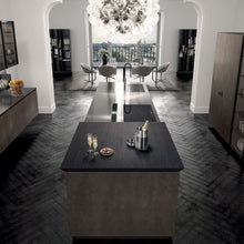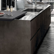 Slide is a system of aluminum guides with diagonal sliding movement that creates a pull-out peninsula applied over the kitchen top. Its allows the extraction of a snack corner table that hosts up to 4 people having lunch, dinner, some drinks or snacks. The mechanism can be added to any peninsula or island, following the main standard measures of kitchen producers.