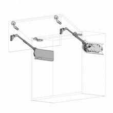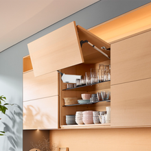 The AVENTOS HF bi-fold lift is the ideal solution for high and mid wall units. it can be used for cabinet heights of 480 to 1040 mm and cabinet widths of up to 1800 mm. Even large fronts fold up and out of the way, giving users great freedom of movement. So much so that wall cabinets can be left open during cooking.