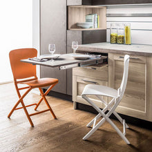 System that allows the extraction of a peninsula table from a simple drawer compartment. It is sufficient to open the front of the hinged drawer to sit at the table, giving more functionality even to limited spaces. Protagonist in small kitchens and kitchenettes that require a space-saving table or simply as an extra worktop that can add practicality during the preparation of a meal in any kitchen, making it more versatile.