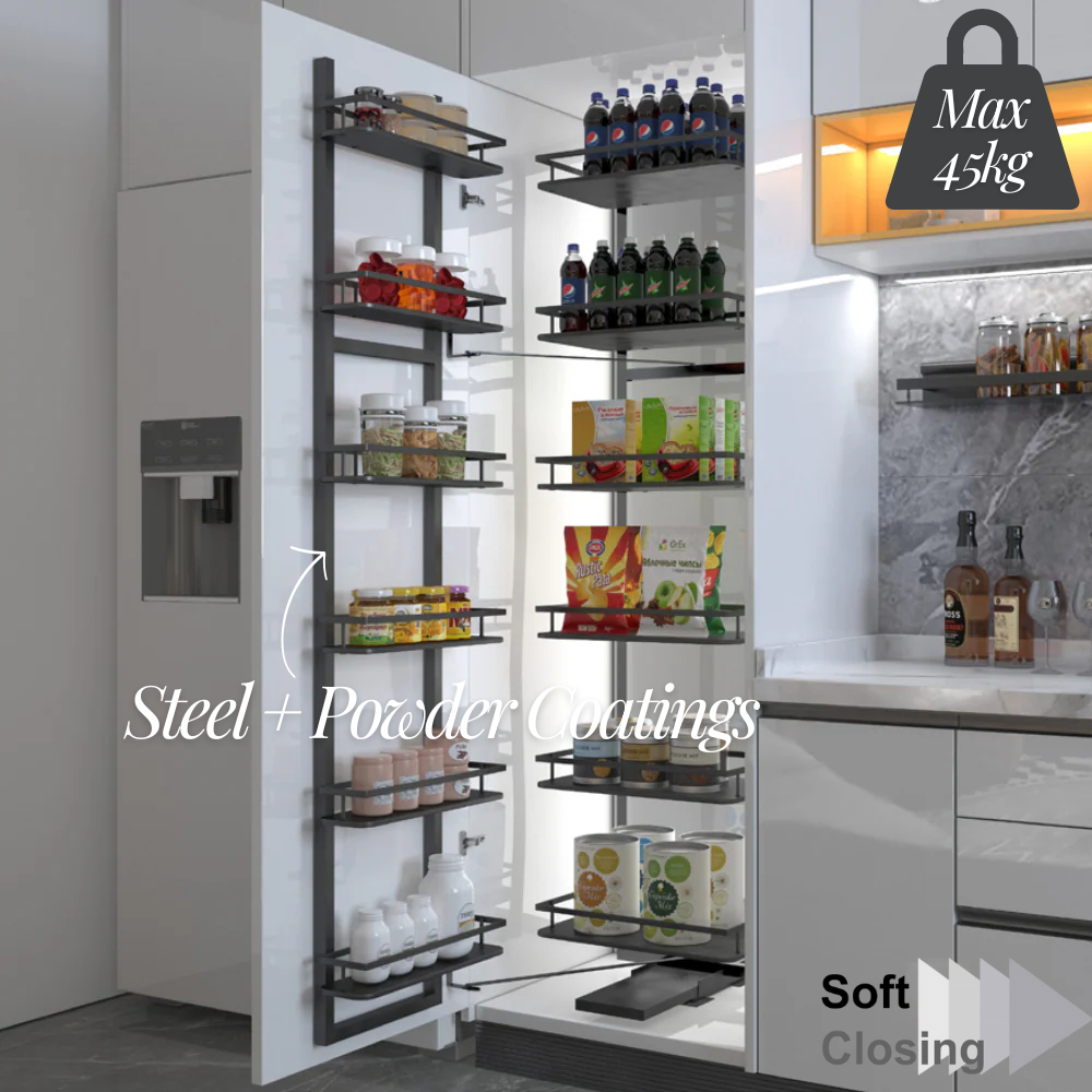 The MIRAI Tall Pantry Unit is the ultimate solution for optimizing storage in tall kitchen cabinets, featuring a sleek dark grey finish, durable construction, and a soft-closing mechanism for a premium user experience.