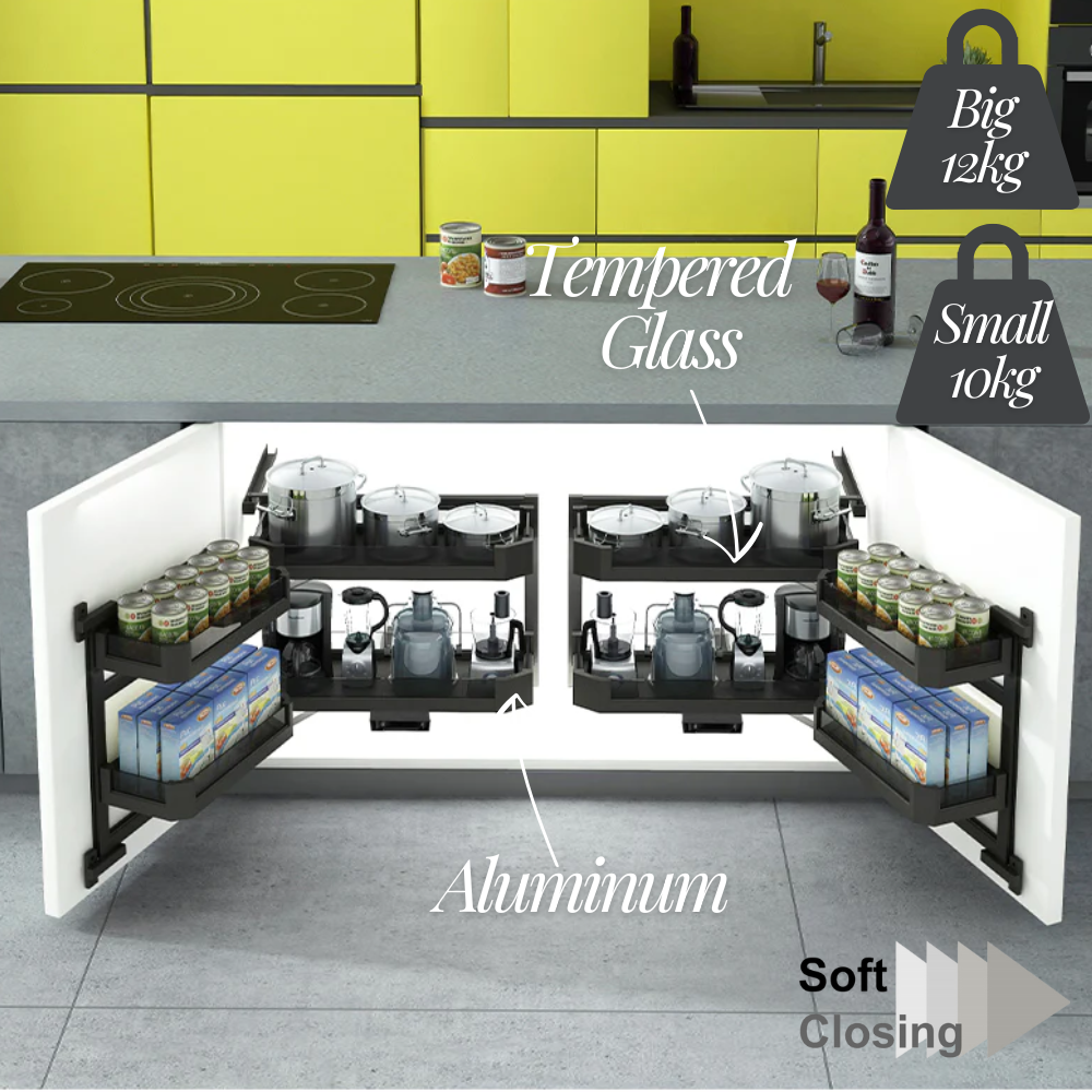 - Thicken toughened glass and aluminum alloy guarantees the weight capacity of the basket, each smaller basket is able to carry items for 3KG and each bigger basket is able to carry 7kg.